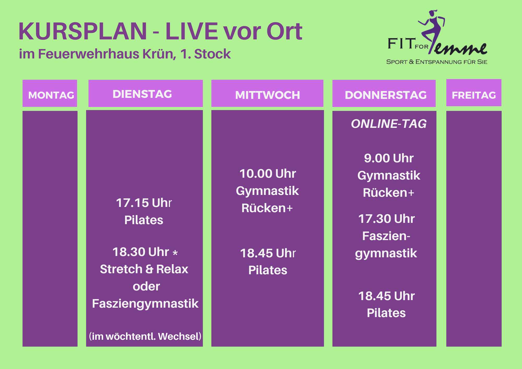 In meinen Praxisräumen biete ich verschiedene Massagen an. Schwerpunkt ist eine Triggerpunktmassage, die effektiv tiefsitzende Verspannungen löst. In meinen Live Kursen biete ich vor Ort Pilates, Rücken+, Fasziengymnastik und Stretch & Relax in kleinen Gruppen an.